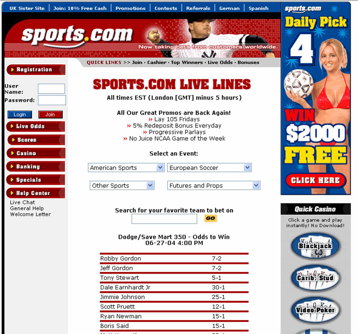 Sports.com came into being in July 2002, when UK based Sportingbet, a publicly-traded company, purchased the Sports.com website. The stability of an established firm and the marketability of the Sports.com brand combined to create one of the most popular online betting destinations, one that offers a myriad of events, promotions, and betting options.
