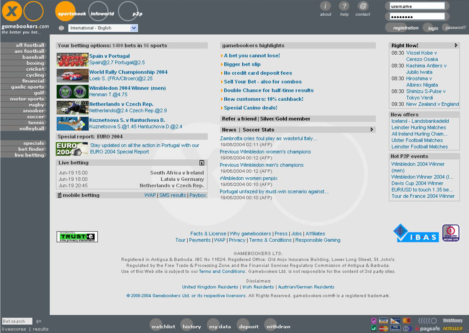 If you’re betting on something more common, a vast array of bets and options are available. It is indicative of the quality of the Gamebookers' design that these innovative options add to rather than confuse the betting experience. For example, there are nine types of bets on soccer matches, all of which can be reached simply through a tab system. Furthermore, clicking on the appropriate logo brings a brilliant pop-up box with news and statistics relating to the relevant teams and competition. The news and statistics is gleaned from the Gamebookers' excellent ‘Infoworld’ feature, which is a comprehensive news, analysis and statistics service.