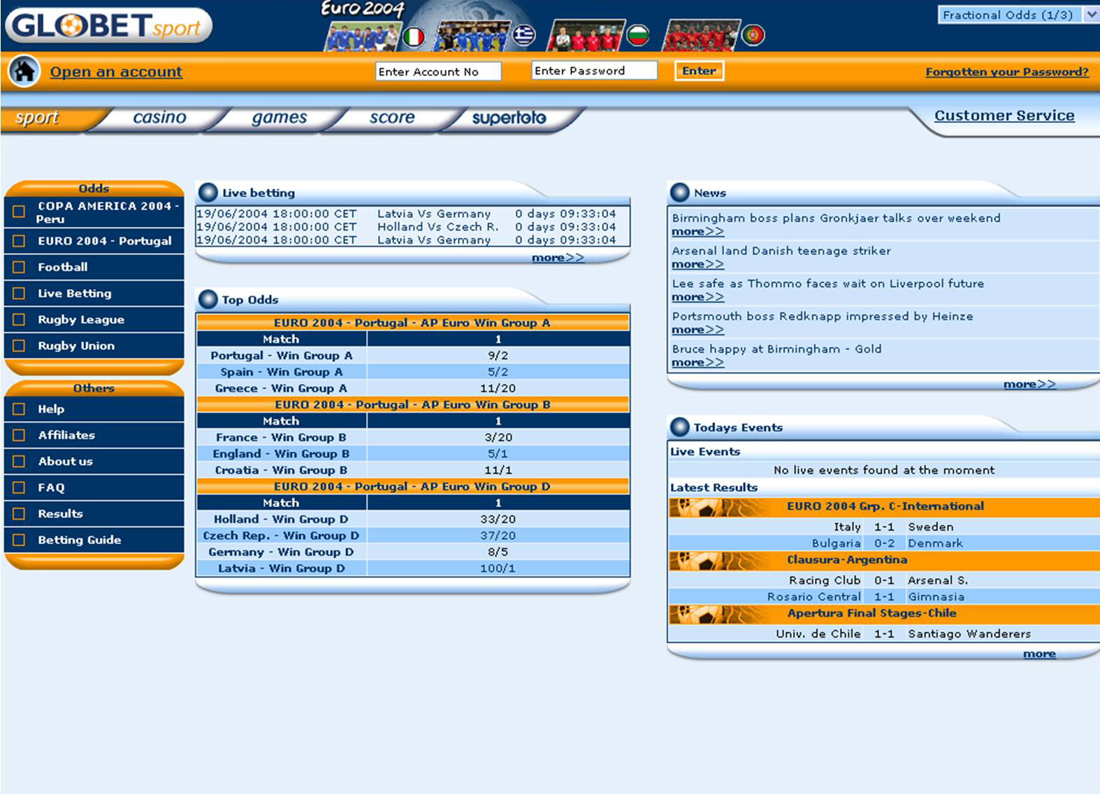 The GloBet site itself is very easy on the eye, with a stylish interface in complementary blues and orange. Navigation is fairly straight-forward, although once you go forward a page you can rarely navigate back without using the ‘back’ button. The account screen and options are simple and effective. Overall, the site is both fast (except in Russian, where the alphabet typically slows things down) and easy to navigate, although one suspects this is as much due to the limited content as the good design.