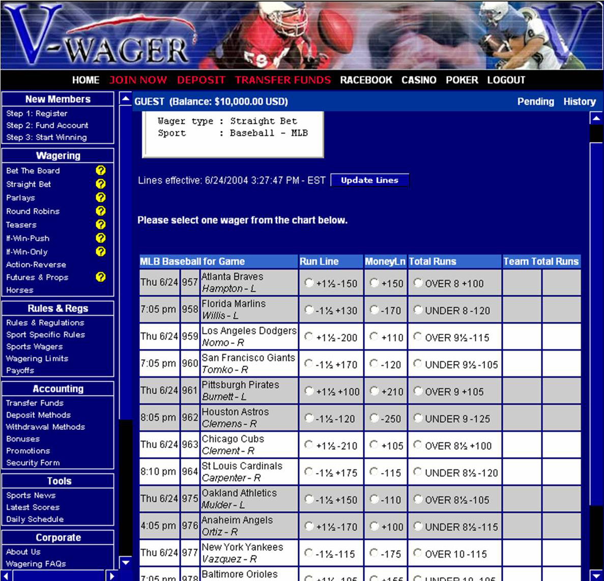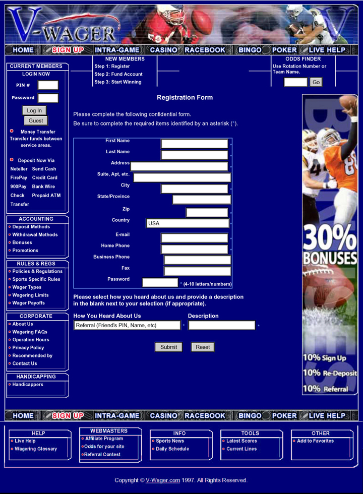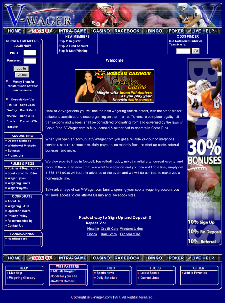 Located in San Jose, Costa Rica, v-wager.com has established itself as one of the most secure and legitimate online sportsbooks by also being a member of the Costa Rican Chamber of Commerce. With v-wager.com, customers can bet online without any fear of fraud: The company offers payouts 7 days a week, and the sportsbook is fully insured by the Swiss American Bank. The v-wager.com website is dedicated to all types of online wagering. Although the company offers a full service sportsbook website, it also offers an online racebook, casino, bingo, poker and an intra-game section. The intra-game option is one of the most interesting aspects of v-wager.com. With this option, clients are able to wager using a person-to-person sports trading model. In other words, customers are able to make sports trades directly with each other.